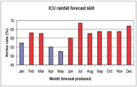 The capability of the ICU multi-model ensemble rainfall forecasts have been tracked for more than eight years now, and there are statistical data indicating when the technique has had good ‘skill’, or the ability to provide accurate climate projections. It is very clear that the ICU has good skill for a majority of the year, and not suprising that the strongest forecast periods are during spring and summer, as well as mid–winter. The period of least skill is during mid–to–late autumn, which corresponds to the time when deterioration of ENSO events typically happens, and as a result the associated strong (as well as predictable) regional climate patterns that accompany these events are diminished.
