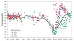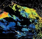 The experiment involved three vessels: the Canadian Coast Guard vessel John P. Tully, a Mexican vessel El Puma and, later in the experiment, a Japanese research vessel Kaiyo-Maru. A patch of HNLC ocean of around 70 km2 was labelled with SF6 tracer and enriched with dissolved iron. The result was a more than tenfold increase in phytoplankton stocks, the removal of large amounts of carbon dioxide, and the production of DMS. The phytoplankton bloom grew to be large enough (700 km2) to be visible from space (see arrow on image) and yielded exciting results for both marine and atmospheric scientists. It was possible to follow the production of DMS in the ocean during the plankton bloom, and also its subsequent transfer to the lower atmosphere.