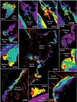 Most of New Zealand’s coasts and inland waters fall into the second category. Powerful new techniques for obtaining the constituents of these waters from their remotely sensed colour are now available, giving us an unprecedented ability to determine the composition of New Zealand’s coastal and inland waters from space. The first satellite images of suspended particulate material (SPM), chlorophyll a concentration (chl-a, a proxy for phytoplankton abundance) and dissolved coloured organic matter (CDOM) processed at NIWA are shown. Such 1-km-resolution data will be available until at least 2015, courtesy of Earth-observing satellites from NASA and the European Space Agency. This new capability has relevance to a number of existing NIWA research projects, and the ocean colour group looks forward to working collaboratively with them to develop applications of ocean-colour remote sensing for the future.