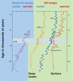 Past temperatures recorded in the West Antarctic Ice Sheet at Byrd Station and in the ocean off New Zealand; the similarity confirms the intimate link between the two sites. ACR is a period known as the Antarctic Cold Reversal. Note how the cooling in the ACR affected Antarctica and both surface and deep waters off New Zealand.