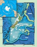 As the eastward-moving ACC circles Antarctica, it encounters two prominent constrictions: the Drake Passage off South America, and the submarine continent off New Zealand. These constrictions force the ACC to ride well north of its usual path (see inset map). Off southern New Zealand, the interaction between current and seabed is dramatic. As the ACC strikes the Campbell Plateau, large eddies form and migrate north along the plateau edge, stirring sediment in water depths exceeding 3000 m. Water as cold as 5 °C almost reaches Chatham Rise.