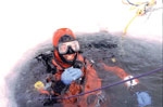 We use the same gear as for diving regular waters, only more so. The drysuits include gloves and the hood has to seal to the mask. And the insulation under the drysuit is thicker than usual. For safety’s sake, we wear two tanks and two regulators. The commonest problem is for a regulator valve to freeze open; if that happens the diver must switch immediately to the second regulator and then return to the surface.