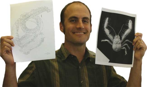 Andrew also brought with him two examples of a second species of the yeti crab, collected on cold seeps off western Costa Rica. The first yeti crab, a single specimen of Kiwa hirsuta, was collected on hot vents south of the Easter Islands and was sufficiently unique to warrant establishment of its own family. Hence, Andrew’s two specimens of the new species increase the number of collected specimens of this family worldwide by 200%. Andrew is describing this new species in collaboration with Kareen Schnabel (NIWA). Funding for Andrew has been provided through Census of Marine Life’s Chemosynthitic Ecosystem Science (ChEss) Training Awards for New Investigators (TAWNI).