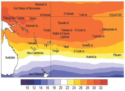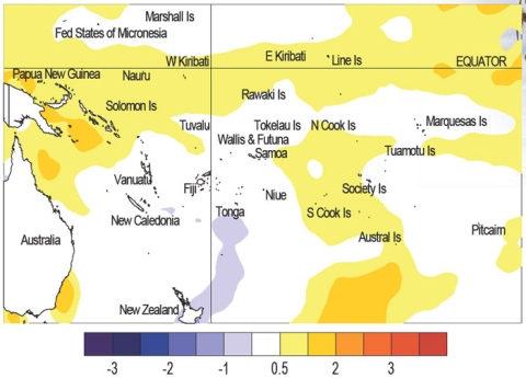 Warmer than normal conditions occurred as a whole across French Polynesia, with +0.4°C to +1.6°C above normal temperatures. Increased frequency of easterly wind were recorded in the Marquesas and the northern part of the Tuamotu Archipelego. Across the Southwest Pacific in Fiji, air temperatures were average to below average, with some nights dipping below 15°C due to strong southerly flow.