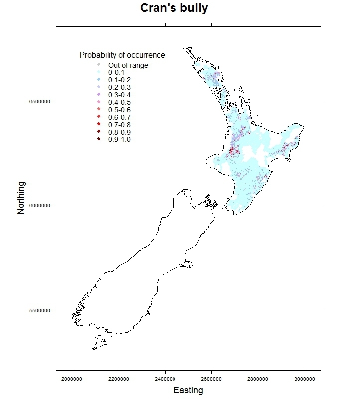 Crans bully is strictly a North Island fish and is found in most areas. Its rarity in the arc northeast of Lake Taupo is thought to be a long-lasting effect of the Taupo eruption over 1800 years ago. As Crans bully has no marine phase, their ability to colonize new river systems is limited, and once they are gone from an area it is unlikely they will re-colonize on their own.