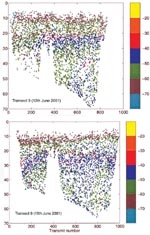 We used CREST, a high-frequency, split-beam, echo-sounder and computer-based data acquisition system (see Water & Atmosphere 4(1): 13–17) to sample fish populations in several North and South Island lakes during 2000/01. The CREST data – and our knowledge of the depth distributions of trout, smelt and bullies in Lake Rotoiti – allowed us to estimate the target strength for these three fish species so that we could discriminate between them. (Target strength is an acoustic measure of fish size.) From the distributions of the fish and how fast they changed, we could then decide if it would be feasible to assess their population size by using acoustic transects to cover the entire lake in a day.
