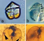 During the same period, there were blooms outside the Hauraki Gulf dominated by Rhizosolenia (diatoms) and Noctiluca, but in this case we detected no Karenia species. Healthy Noctiluca cells were discovered in the region, feeding mainly on diatoms and the larvae of several marine organisms, with a small number feeding on cysts from Alexandrium cf. catenella, an algal species that produces paralytic shellfish poison.