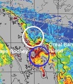 Ocean colour images from September to December 2002 showed the build-up of several patches of high-chlorophyll water along the North Island northeast coast. In the Hauraki Gulf, the build-up apparently started in late September. Map A (above) shows elevated chlorophyll concentrations covering a large area stretching from Waiheke Island inside the Hauraki Gulf to Little Barrier Island at the entrance in the north. Between early and mid October, this high-chlorophyll patch of water coincided with areas where bloom proportion of harmful Karenia species and marine life kills were reported, providing some evidence about the extent of this bloom in the Gulf. Although Noctiluca scintillans also bloomed simultaneously with Karenia species, its lack of chlorophyll makes it difficult to see from space.