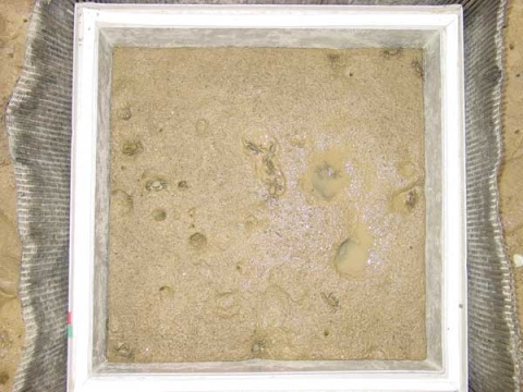 To measure the changes in nutrient concentrations over time (the nutrient flux), we deployed a benthic chamber in each of the 16 cages. These chambers encapsulate a known volume of water over the crab burrows on an incoming tide, enabling us to sample from the same water body at regular intervals until the tide retreats. Estuarine sediments support a fine layer of microscopic algae on the surface known as microphytes which use nutrients released from the sediments for growth as well as providing a food resource for the crabs and other organisms. To establish how microphyte communities are affected by the crabs, we measured nutrient flux during daylight when the microphytes photosynthesise and at night when they don’t. By sampling both day and night, we also ensured that the crab’s behavioural patterns were not altered. After a night of intense measurement, sleepdeprived scientists collected further information from the cages by making resin casts of the burrows to record their size and shape, and recorded microphyte density, sediment particle size, organic content of the sediments, and the diversity and density of other animals living around the crab burrows.