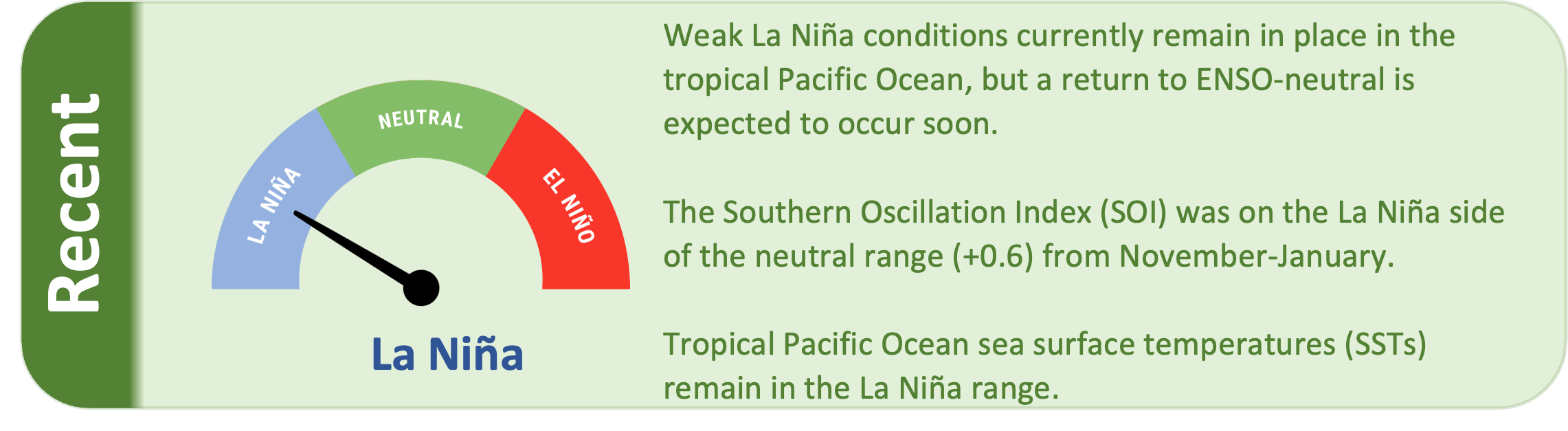 The Southern Oscillation Index (SOI) was on the La Niña side of the neutral range during November-January (+0.6), while the January value was +0.8 (also on the La Niña side of neutral).