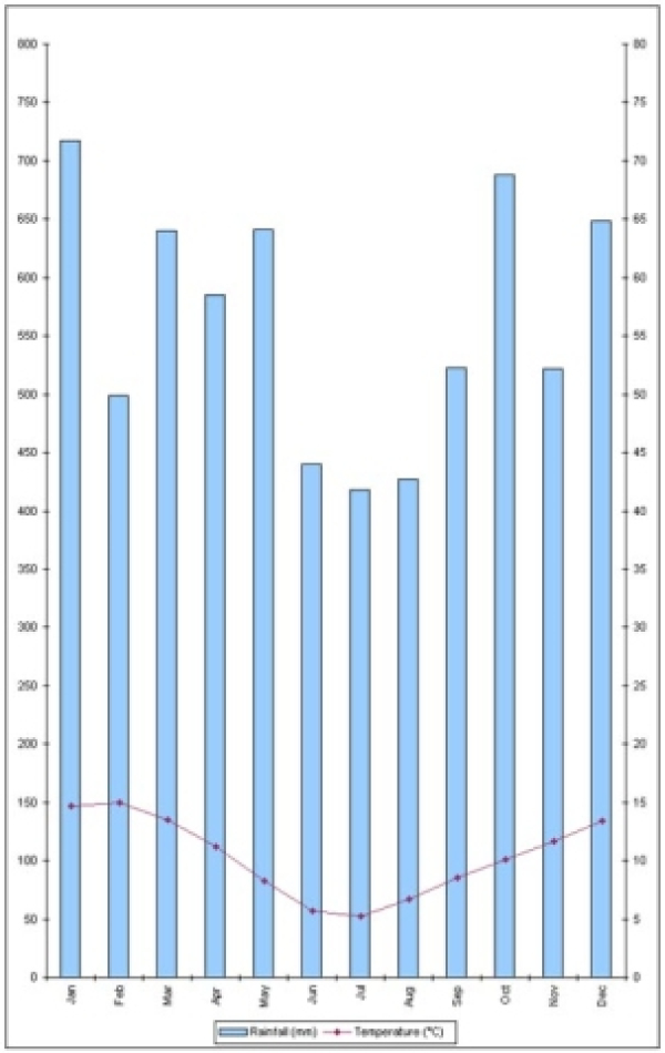 Although mean annual rainfall is very high, dry spells do occur, especially in late summer and during winter. Heavy rainfall occurs from the northwest. Summers are mild.