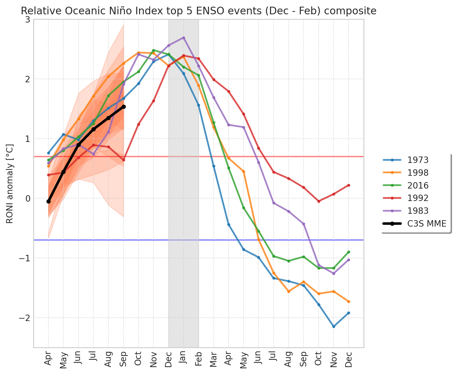 ESNZ downloads and processes forecast data from multiple global circulation models (GCM) to support its Seasonal Climate Outlook. One way to monitor the potential onset and development of El Niño is by extracting the RONI values from these models. Figure 1 shows this, with the range of possible outcomes shaded in orange. There is a wide range in uncertainty, but also a general and rapid upwards trajectory. For context, these forecasts are presented alongside the top 5 historical El Niño events (selected from their eventual summertime values).