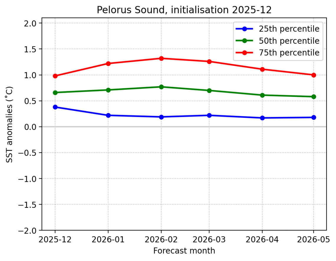 Forecast Pelorus Sound SST anomalies (˚C) over the next 6 months
