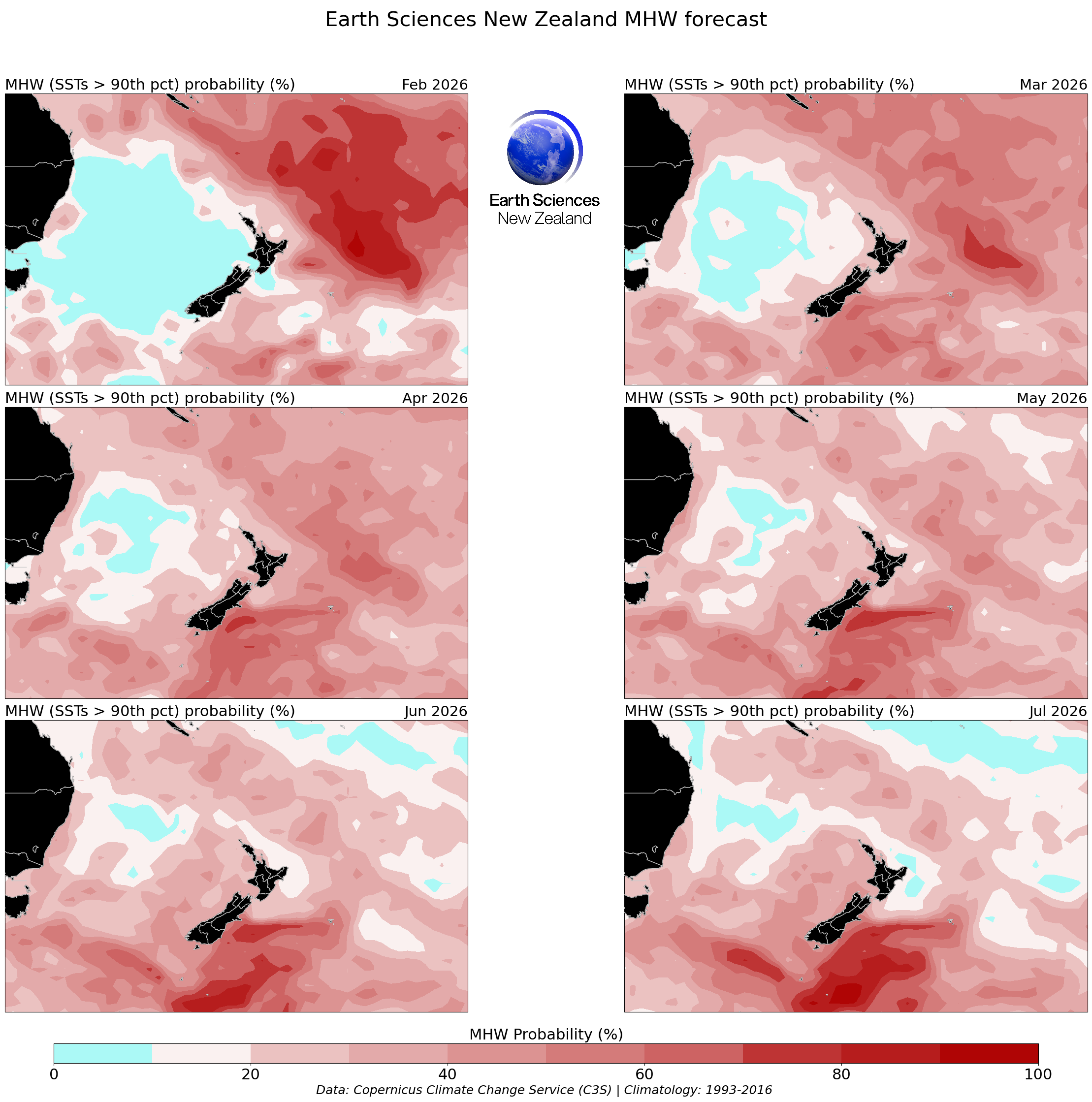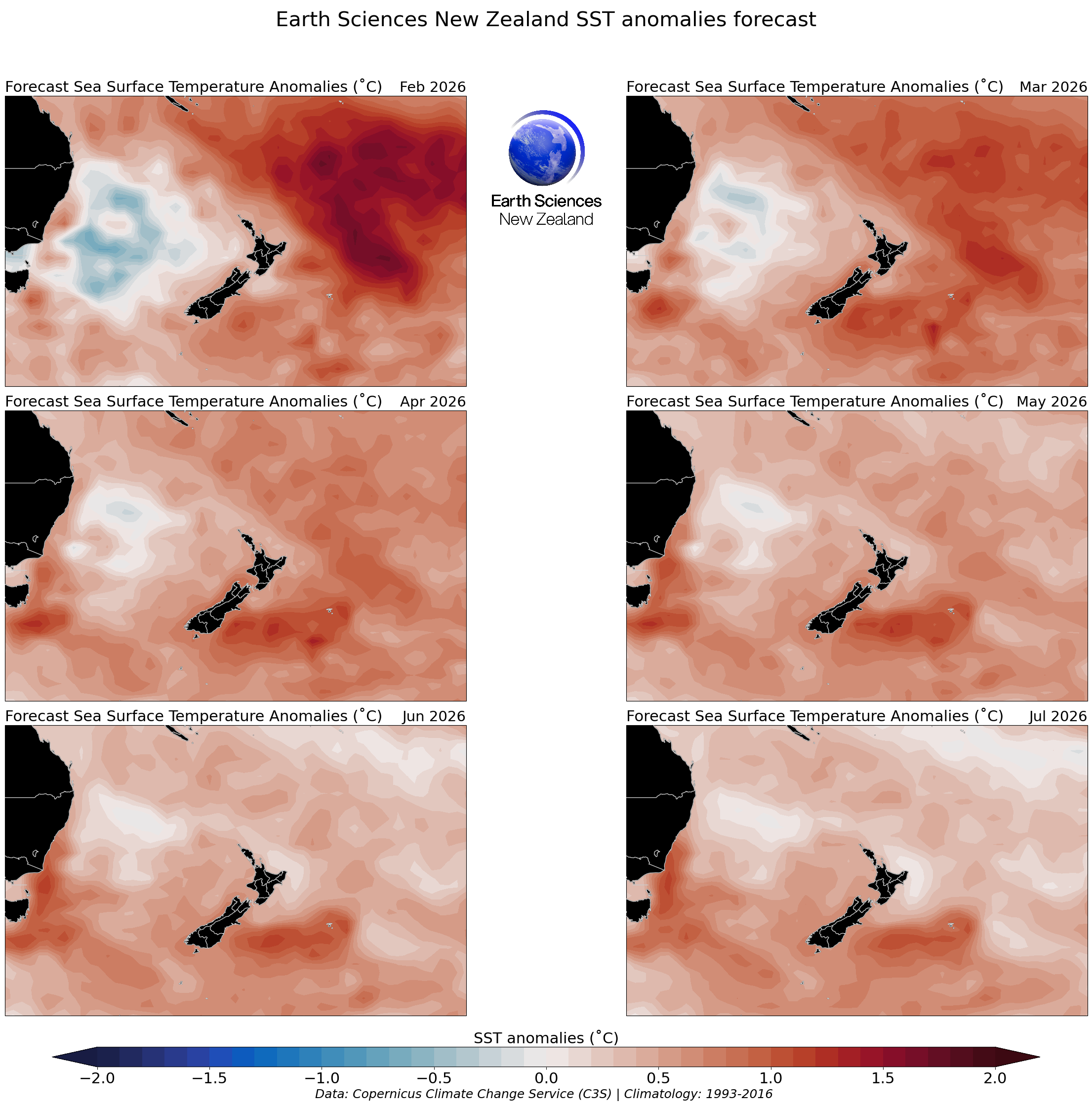 Disclaimer: The forecasts offered in this page draw upon modified Copernicus Climate Change Service Information [2022] (C3S, https://climate.Copernicus.eu). There is inherent uncertainty in forecasting sea surface temperature and neither Earth Sciences NZ (formerly NIWA) nor the licensors of the C3S products (being the European Union represented by the European Centre for Medium-Range Weather Forecasts) make any representations or warranties as to the information and figures on this page. Neither Earth Sciences NZ nor the licensor of the Copernicus products accept any liability for any loss or damage incurred by anyone from use or reliance on the information or figures. This work is funded through NIWA’s Strategic Science Investment Fund from the Ministry for Business, Innovation and Employment.