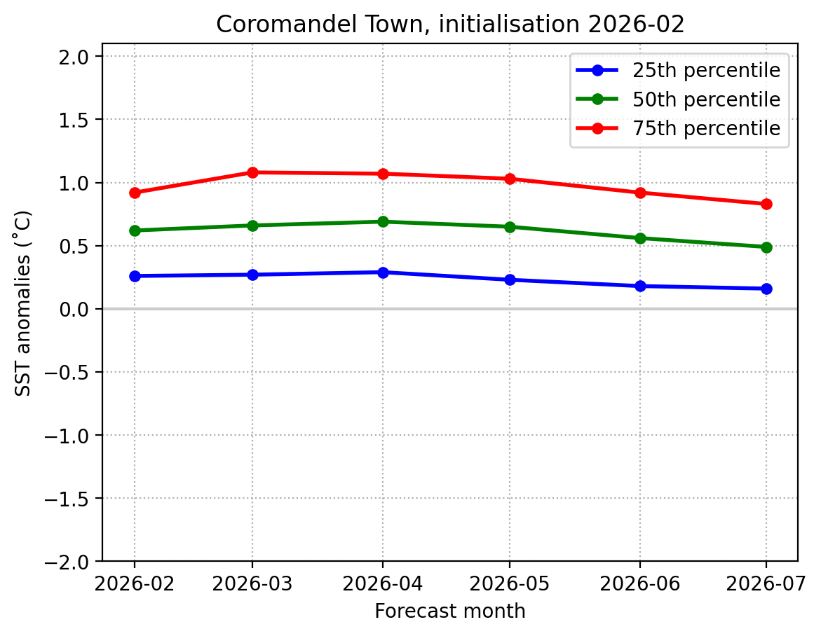Forecast Coromandel Town SST anomalies (˚C) over the next 6 months