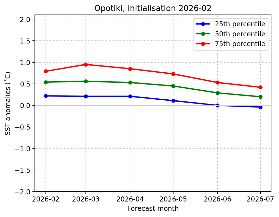 Earth Sciences New Zealand is drawing upon forecast simulations issued by the Copernicus Climate Change Service (C3S, https://climate.copernicus.eu/). Those simulations extend six months into the future, but predictions made further into the future tend to be less reliable than near-term forecasts. For example, forecasts made in June for July may prove to be substantially different to those first made in January.