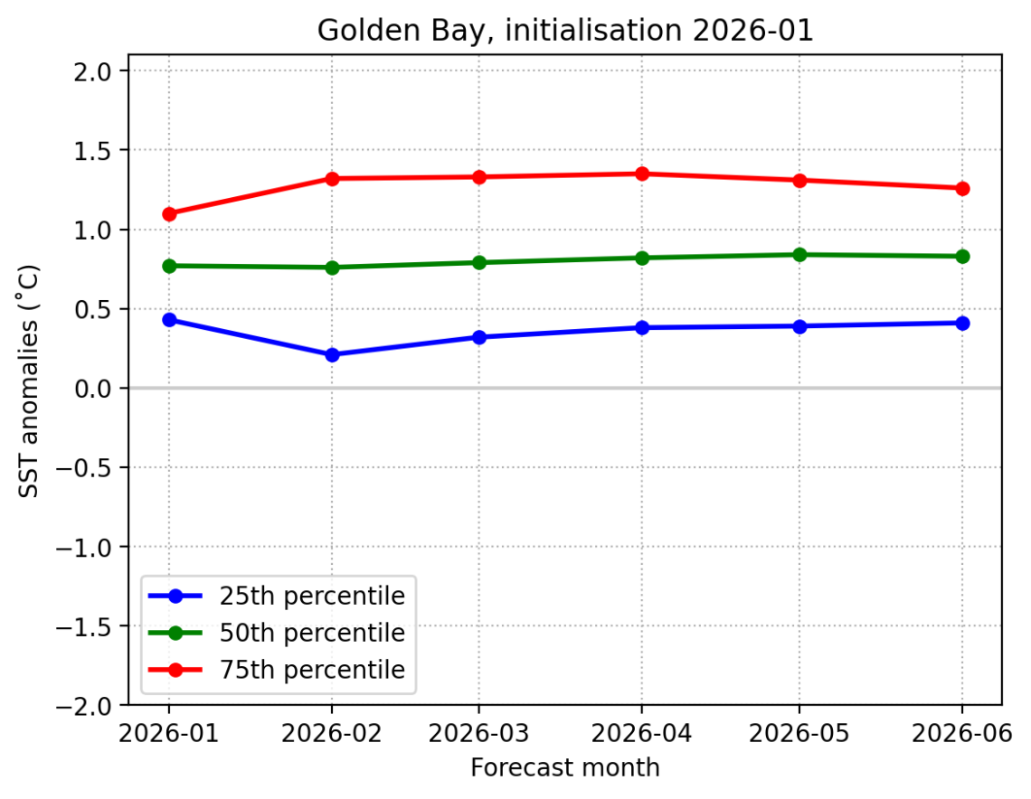 Forecast Golden Bay SST anomalies (˚C) over the next 6 months