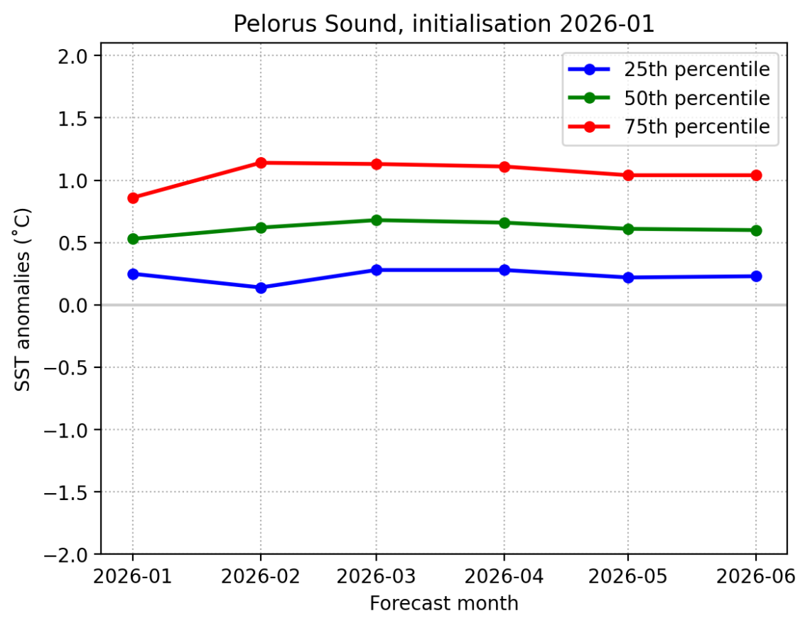 Forecast Pelorus Sound SST anomalies (˚C) over the next 6 months