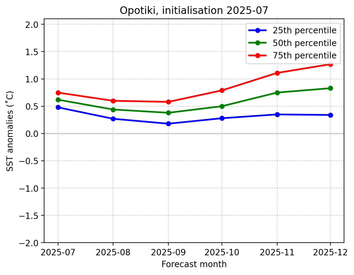 NIWA is drawing upon forecast simulations issued by the Copernicus Climate Change Service (C3S, https://climate.copernicus.eu/). Those simulations extend six months into the future, but predictions made further into the future tend to be less reliable than near-term forecasts. For example, forecasts made in June for July may prove to be substantially different to those first made in January.