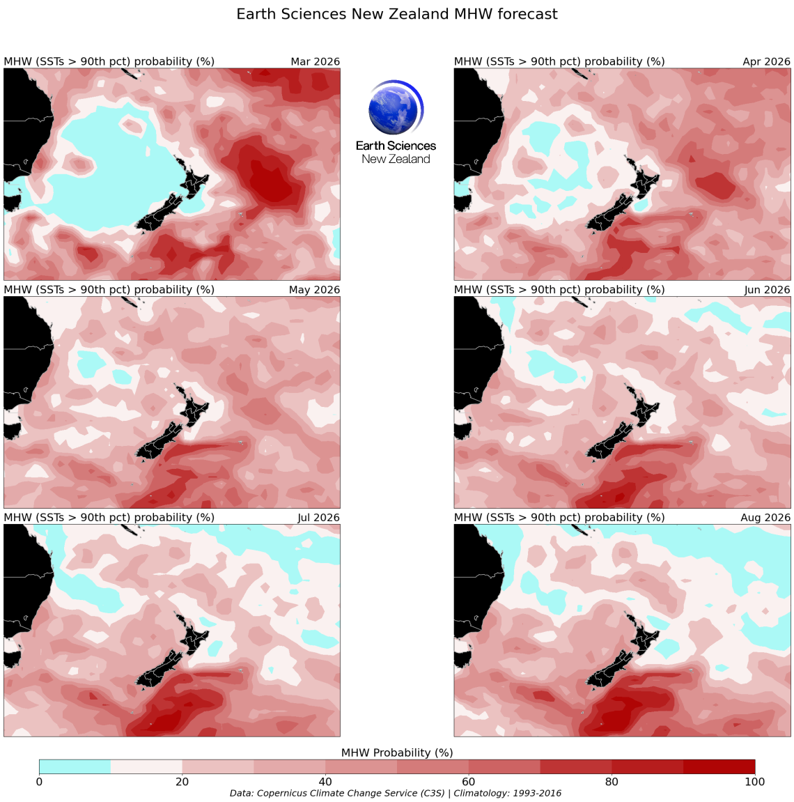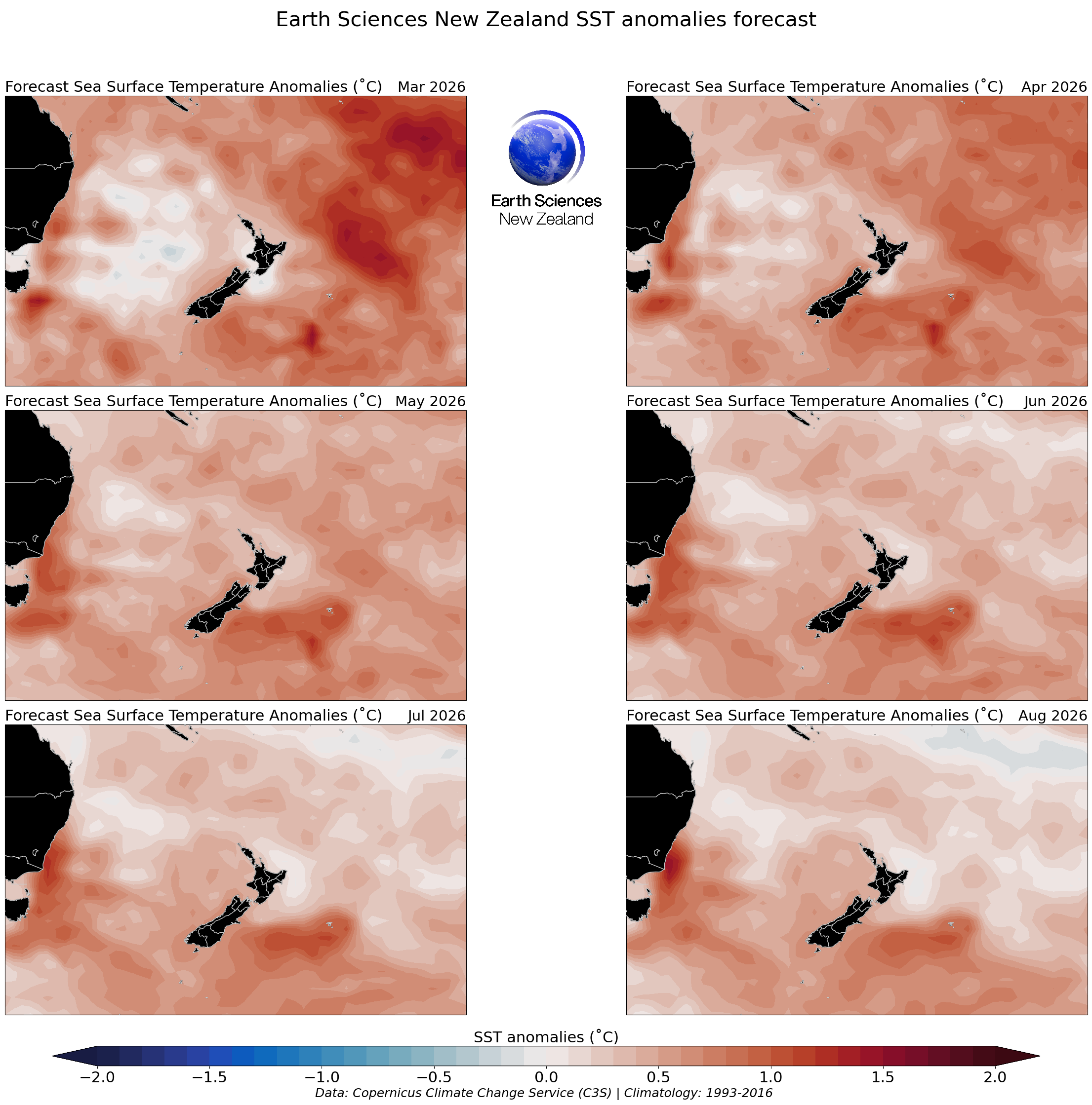 Disclaimer: The forecasts offered in this page draw upon modified Copernicus Climate Change Service Information [2022] (C3S, https://climate.Copernicus.eu). There is inherent uncertainty in forecasting sea surface temperature and neither Earth Sciences NZ (formerly NIWA) nor the licensors of the C3S products (being the European Union represented by the European Centre for Medium-Range Weather Forecasts) make any representations or warranties as to the information and figures on this page. Neither Earth Sciences NZ nor the licensor of the Copernicus products accept any liability for any loss or damage incurred by anyone from use or reliance on the information or figures. This work is funded through NIWA’s Strategic Science Investment Fund from the Ministry for Business, Innovation and Employment.