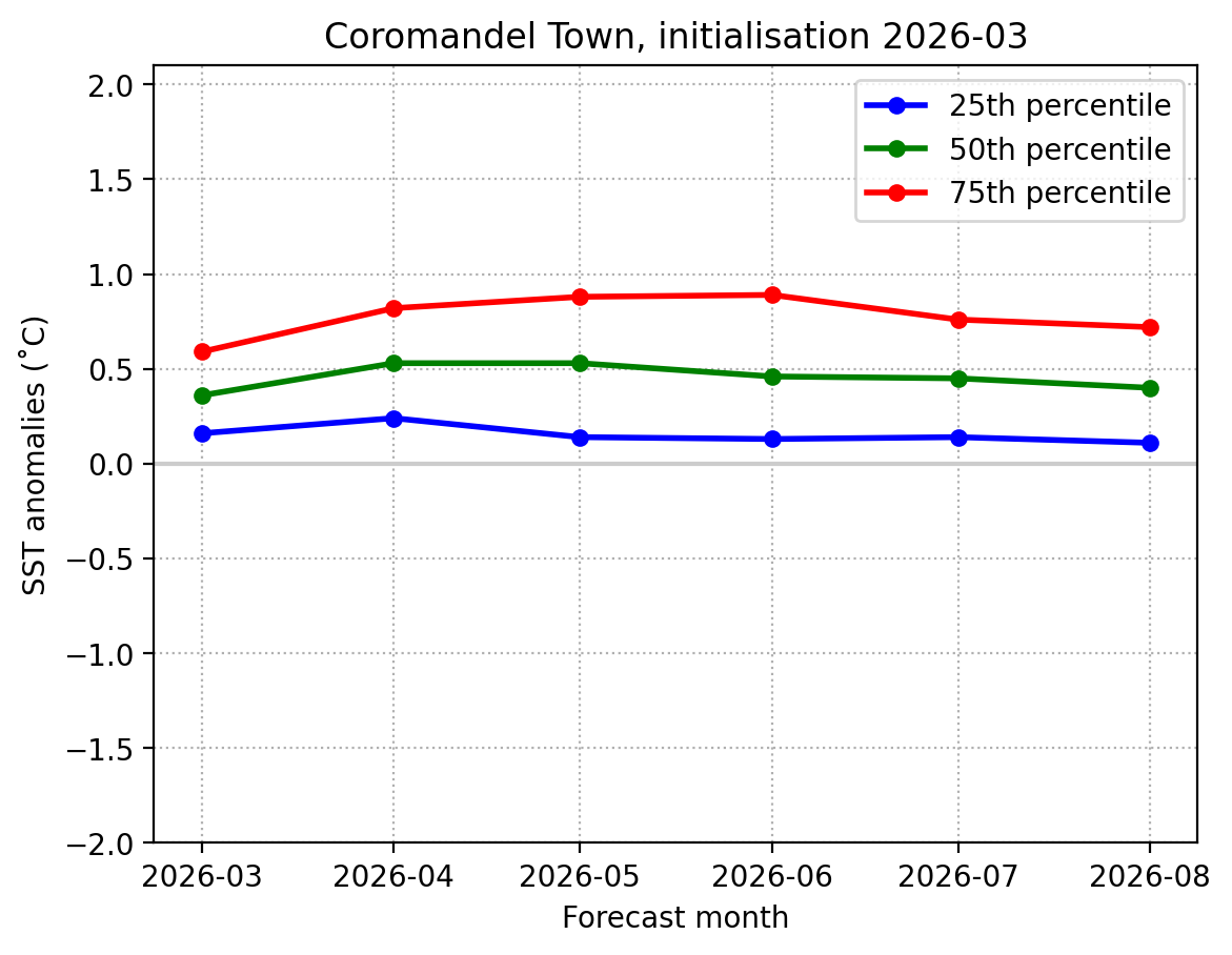 Forecast Coromandel Town SST anomalies (˚C) over the next 6 months
