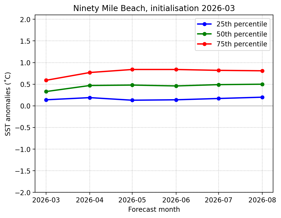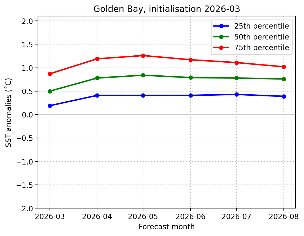 Forecast Golden Bay SST anomalies (˚C) over the next 6 months