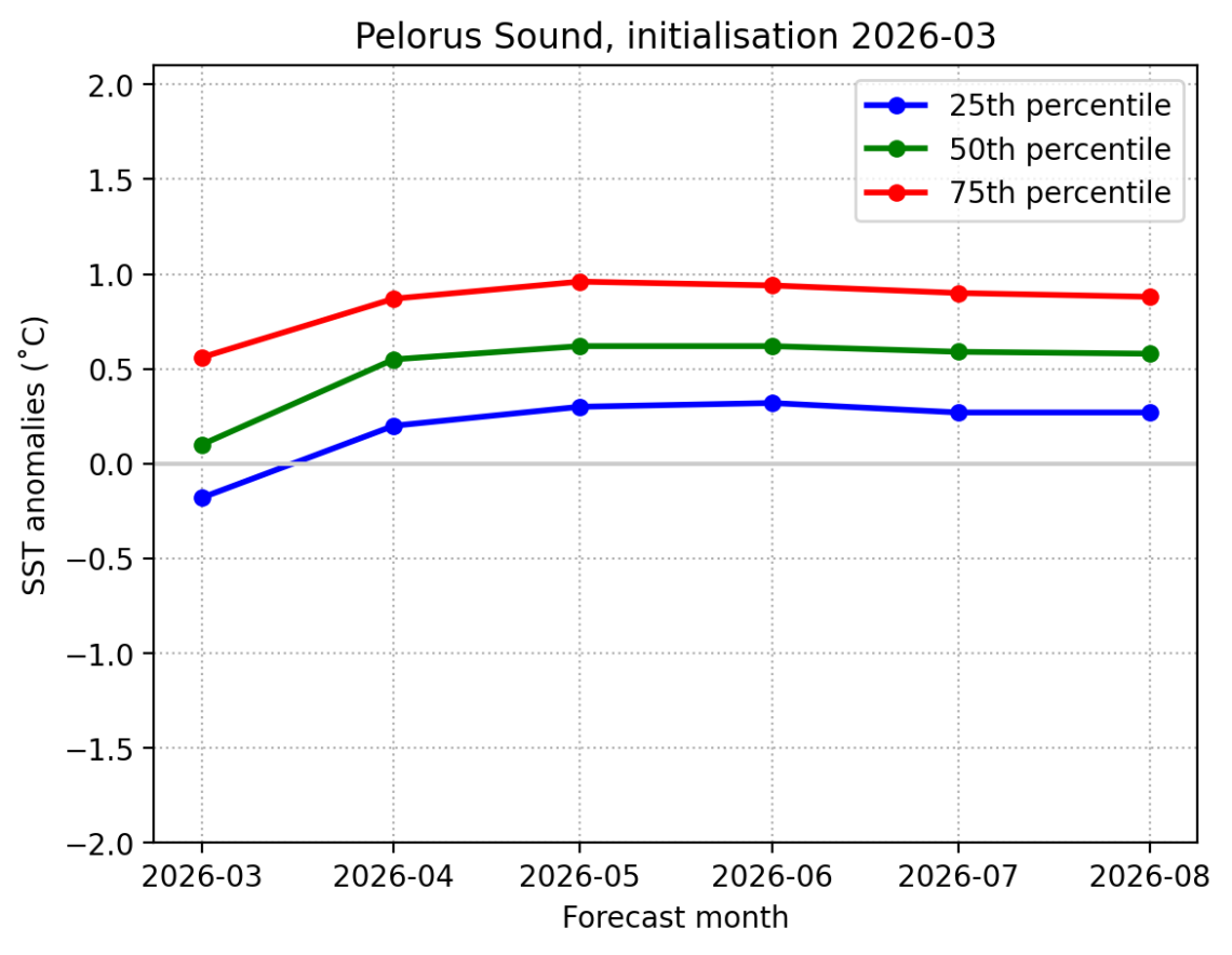 Forecast Pelorus Sound SST anomalies (˚C) over the next 6 months
