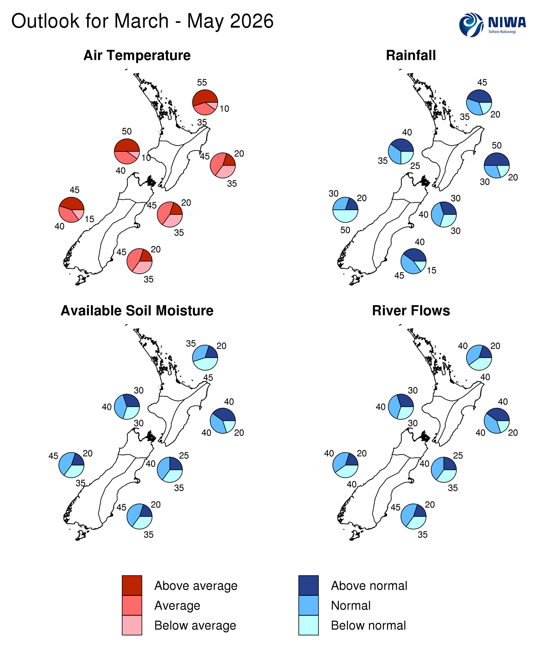 - During March – May 2026, near normal soil moisture levels and river flows are expected for the west of the North Island and the east of the South Island. Near or below normal soil moisture levels and river flows are forecast for the north of the North Island and the north of the South Island, while near or above normal soil moisture levels and river flows are forecast for the east of the North Island. In the west of the South Island, near normal soil moisture levels are most likely, while near or below normal river flows are equally likely.