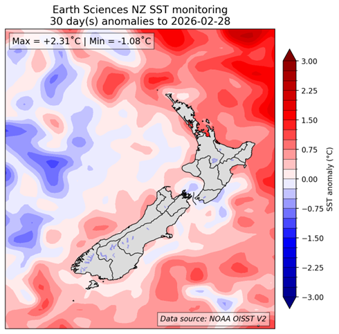 For much of New Zealand, SSTs warmed early in February, peaking in the second week. However, surface wind stress associated with the major depression in mid-February resulted in significant cooling again. Cooler‑than‑average daily SST anomalies are now present off a large portion of the country’s coastlines. Forecasts from coupled ocean-atmosphere models for the next three-month period (see Sea Surface Temperature Update | Earth Sciences New Zealand | NIWA) indicate that SSTs are likely to return to near‑average values around the North Island, while becoming warmer than average again – and potentially intensifying – off the east coast of the South Island.