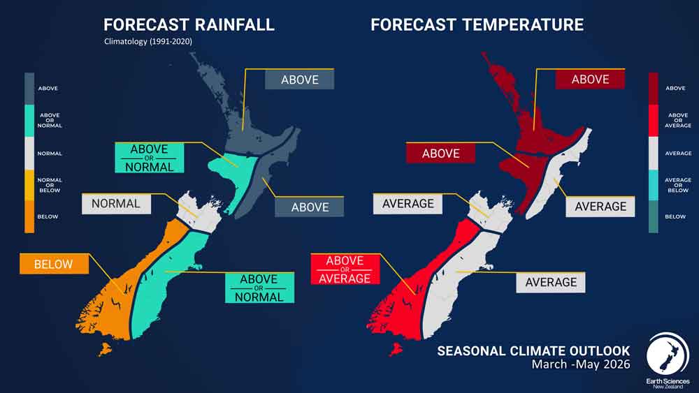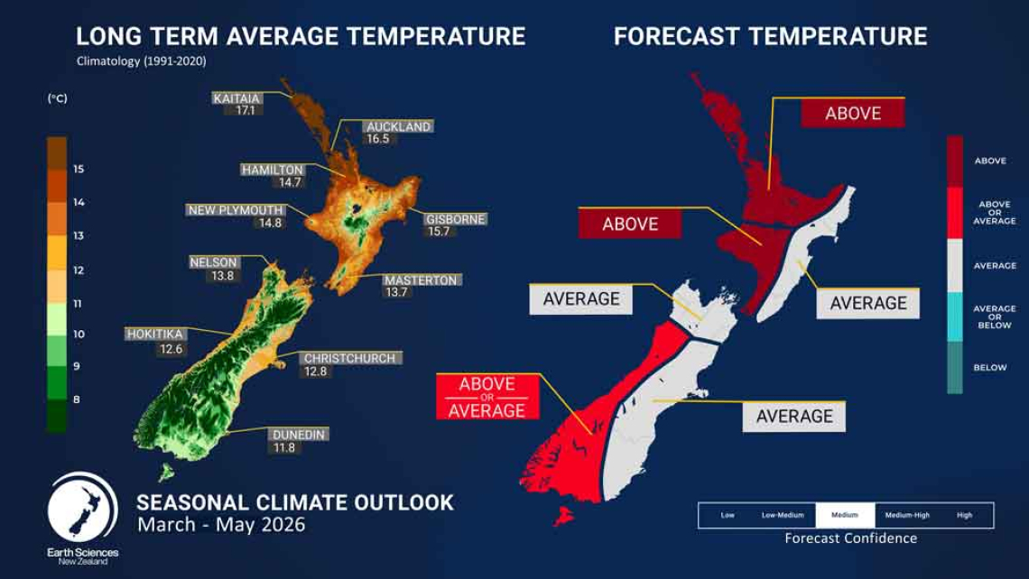 - Seasonal air temperatures for March – May 2026 are most likely to be above average for the north and west of the North Island, near average for the east of the North Island and the north and east of the South Island, and near or above average for the west of the South Island.