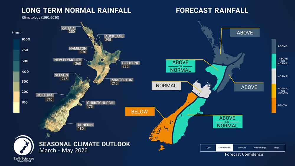 - Rainfall totals for March–May are most likely to be above normal in the north and east of the North Island. Near normal or above normal rainfall is forecast for the west of the North Island and east of the South Island, while near normal rainfall is expected in the north of the South Island. Below normal rainfall is most likely for the west of the South Island. There is an elevated risk of tropical‑influenced weather systems bringing significant rainfall to parts of the North Island, especially at intervals in March and April.