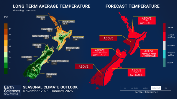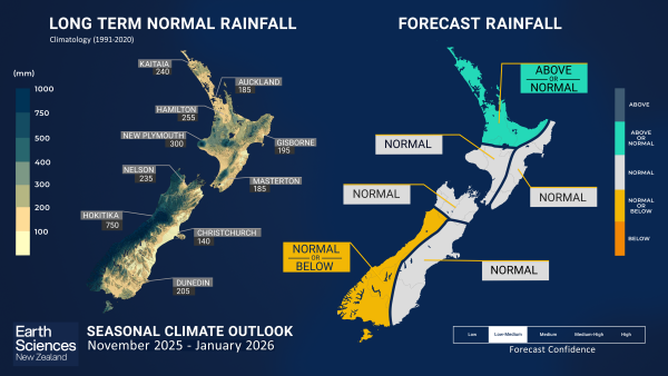 - During November 2025 – January 2026, soil moisture levels and river flows are forecast to be below normal for the east of the North Island, and near or below normal for the north of the North Island and east of the South Island. Near normal soil moisture levels and river flows are expected for the remaining regions of the country.