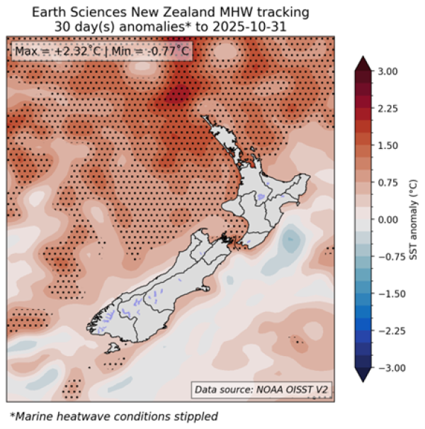 - On top of the cooling seen in September, SSTs cooled further around parts of New Zealand during October 2025, ending the long running marine heatwaves (MHW) conditions off the west coast of the South Island. MHW conditions persist off the upper North Island and are likely to continue. Seas off the east coast of both islands are currently experiencing below-average temperatures. Coupled General Circulation Model (GCM) forecasts suggest SSTs will be near or slightly above average for the remainder of the year, with warming expected later in the period, particularly off the east coast of the North Island. Monitor the SST update for updates.