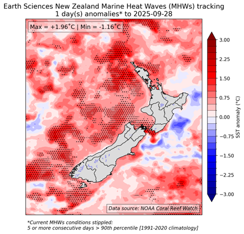 - SSTs cooled markedly around New Zealand during September 2025. Notably, large areas east of the North Island are now experiencing below-average ocean temperatures. Meanwhile, the extent and intensity of marine heatwave (MHW) conditions off the west coast of the South Island have diminished. Coupled General Circulation Model (GCM) forecasts suggest SSTs will generally remain near or slightly above average for the remainder of the year, with warming expected later in the period, particularly off the east coast of the North Island. Monitor the SST update for updates.