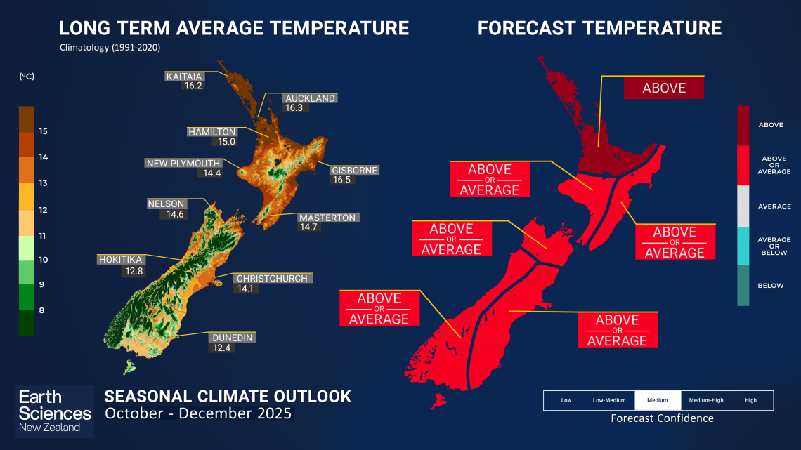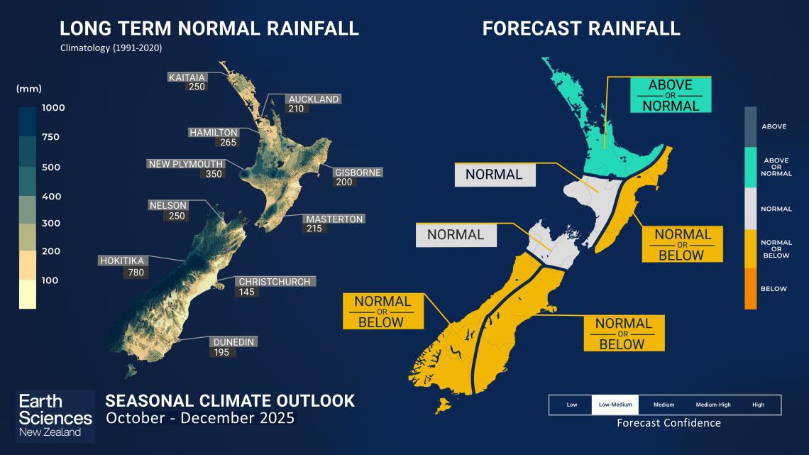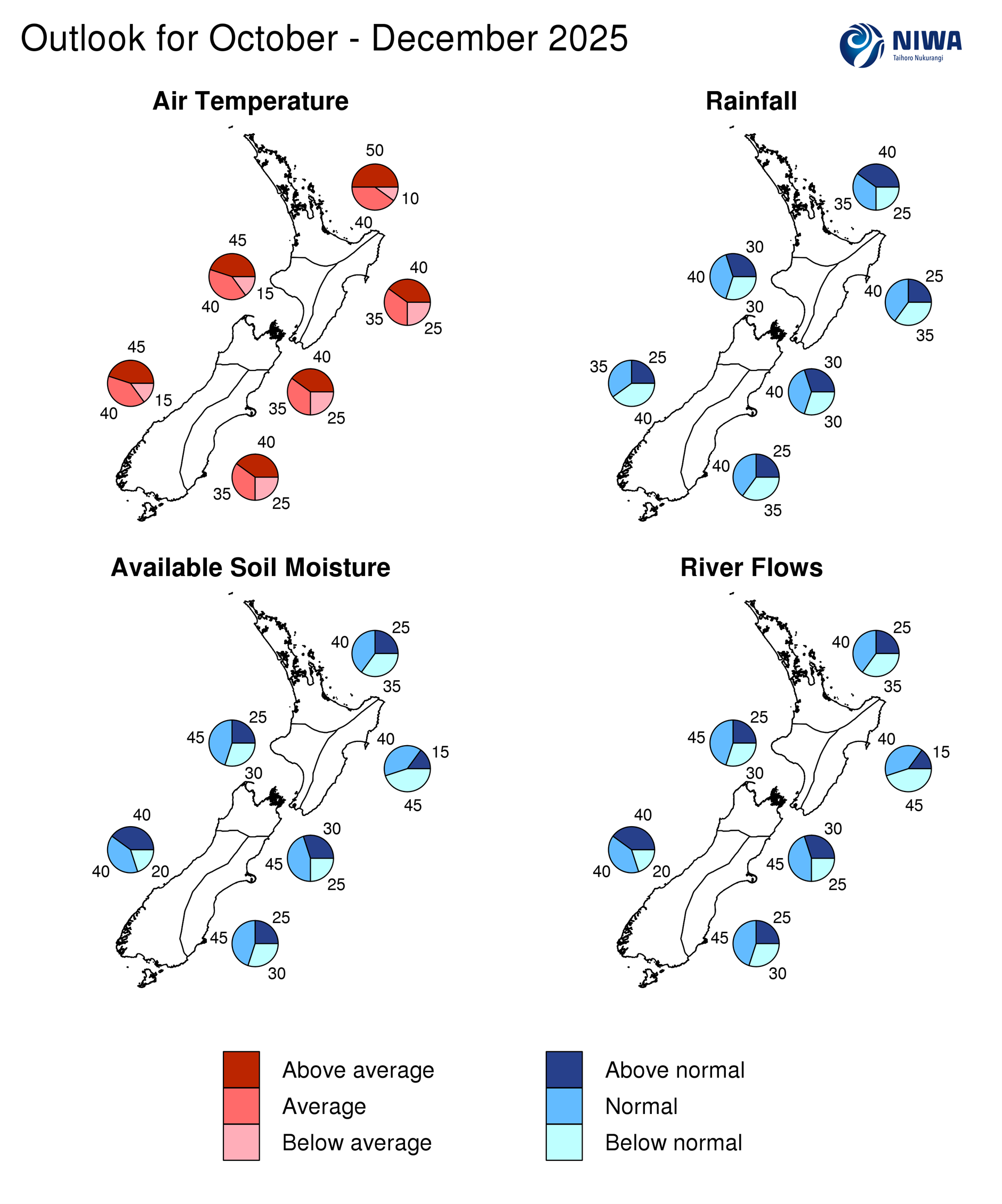 - During October – December 2025, soil moisture levels and river flows are forecast to be below normal or near normal for the north and east of the North Island, while near normal or above normal soil moisture levels and river flows are forecast for the west of the South Island. Near normal soil moisture levels and river flows are expected in the remaining regions of New Zealand.