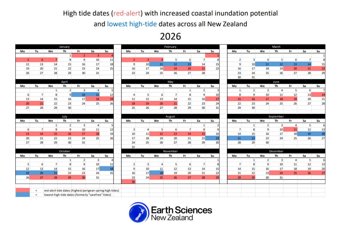 The red-alert and lowest-high-tide dates shown here represent NZ-averaged clusters of extreme tides, rather than every individual perigee or apogee event. Some regions may experience their highest or lowest tides on slightly different days depending on local tidal dynamics. See tide forecasts for specific locations.