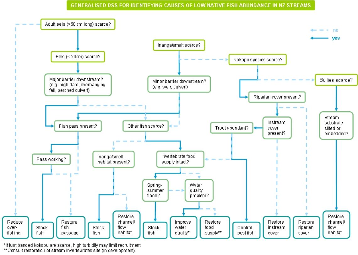 A decision support system (DSS) for the main fish species found in New Zealand streams shows which of the restoration options below is likely to help restore the species in your stream.