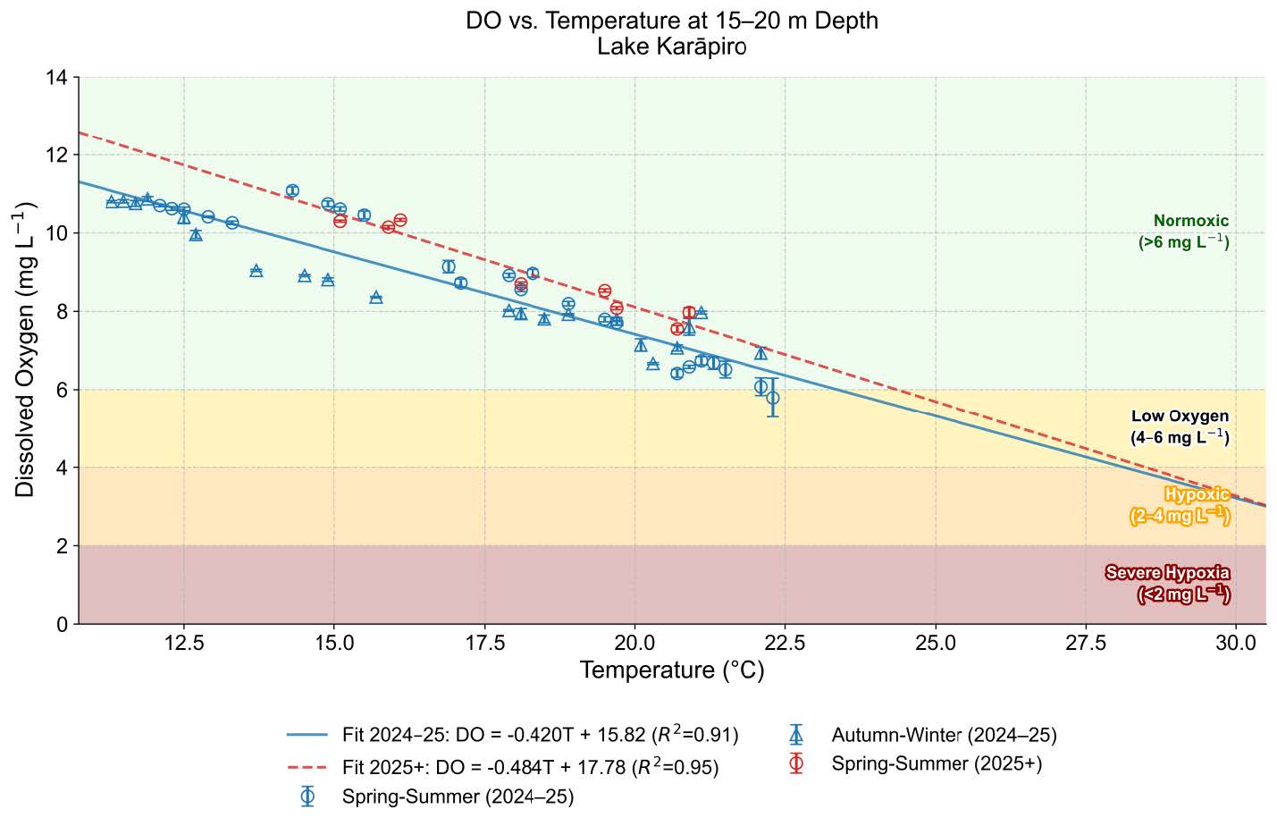 Gold clam metabolism is temperature sensitive, as clam populations increase and water temperatures rise there is likely to be further depletion of dissolved oxygen. This relationship has already been seen during the 2025 summer with depleted benthic dissolved oxygen in Karāpiro (see figure 5).