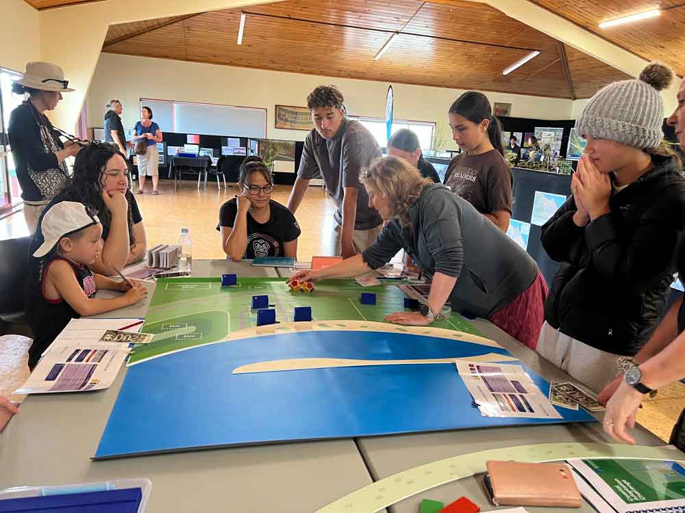 In the Bay of Plenty, the Maketu community is concerned that ongoing climate change will contribute to a range of hazards including more frequent storm and flood events, coastal erosion and inundation, as well as impacts on land, habitats and ecosystems. To support the community to consider the implications of different adaptation options, Future Coasts Aotearoa developed the Coastal Adaptation Challenge, a single or multi-player board game that represents a stylised, yet Maketu-like coastal community. The game, which immerses players in the real-life decisions of a coastal community facing mounting risks, was launched at Maketu’s community Day in December 2025. Debuted at Maketu’s Community Day in December 2025, this activity encouraged strategic thinking and collaboration as participants explored ways to defend against flooding, storm surges, erosion, and waterlogging.