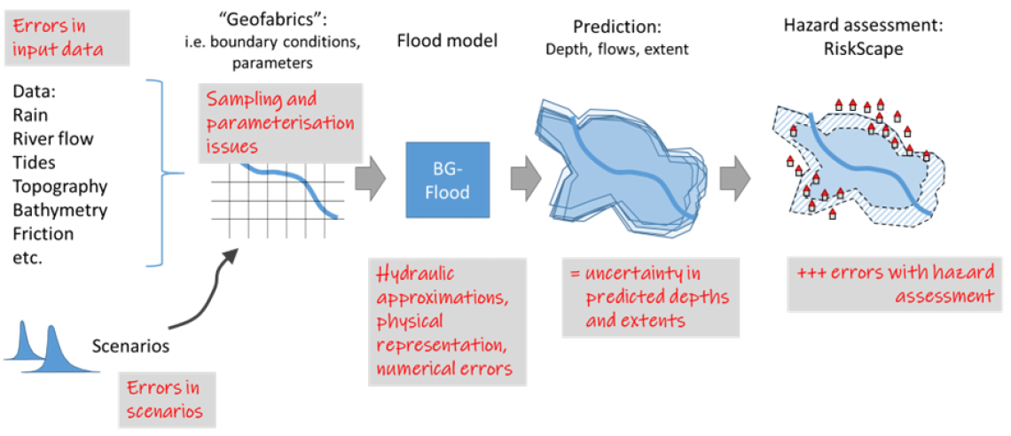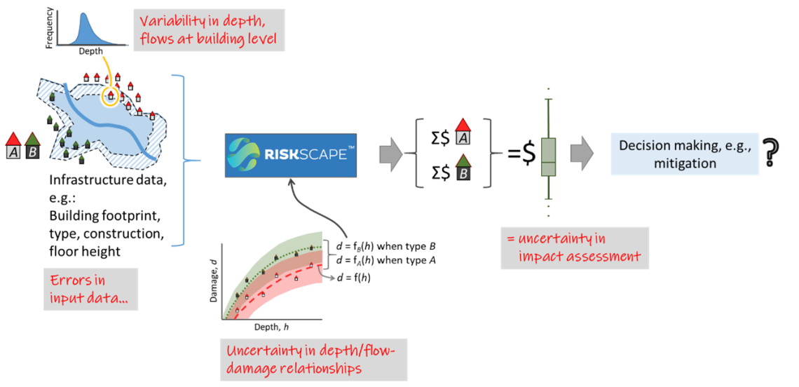 Yet, even if we use the best possible data and model representations, uncertainty will still result from a complex combination of errors associated with source data, sampling and model representation. These uncertainties “cascade” through the risk assessment system (Figure 1a), reducing our confidence in any individual prediction and leading to variability in predicted depths and extents across multiple predictions which account for these errors. These uncertainties, here represented as variability in predicted depths and flows, further cascade through to the analysis of flood impacts (Figure 1b). Uncertainty in predicted depths and flows combine with errors from data such as those for buildings and infrastructure, and the statistical models used to quantify damage (e.g., via depth-damage curves). The end result is uncertainty in quantified damage for a flood scenario, creating issues for the decision-making processes such as determining whether to invest in improved mitigation measures.