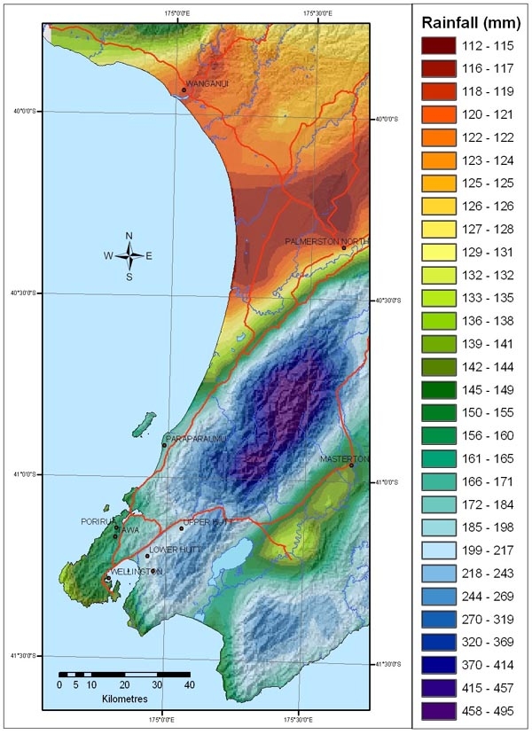 This map of the 100-year return period 24-hour rainfall total is based on HIRDS.