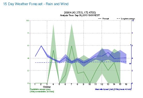 An example of a 15-day weather forecast for mean wind speed (blue) and rainfall (green) taken from a report.