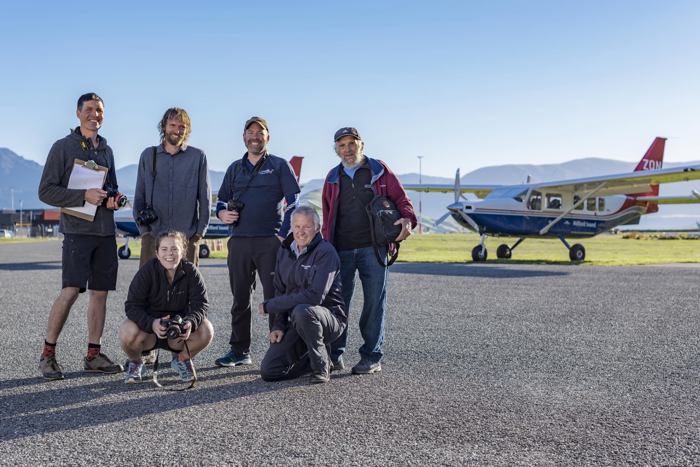 The end of summer snow line survey team from NIWA, Victoria University, Alpine and Polar Processes Consultancy, and Milford Sound Flights. Left to right - Dr Huw Horgan, Dr Brian Anderson, Lauren Vargo, Dr Andrew Lorrey, Andy Woods and Dr Trevor Chinn.