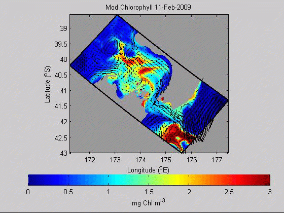 Modelled surface chlorophyll for Hauraki Gulf. Chlorophyll can be used as an indicator as to how much phytoplankton are in the water. Nutrients that come out of the Firth of Themes act as food for phytoplankton and this can be seen as higher chlorophyll concentrations near the Firth of Themes. These chlorophyll blooms can be seen moving and changing directions as the ocean currents carry them around the Hauraki Gulf.