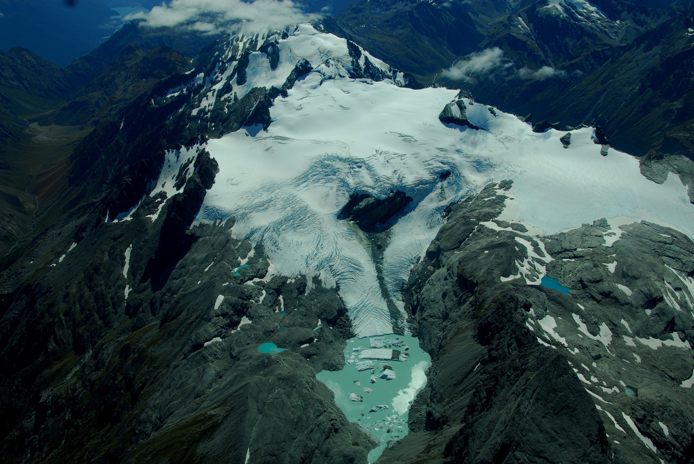 Park Pass: a glacier in retreat, showing a lake of melted ice at its foot. Park Pass glacier is one of the 50 index glaciers that have been monitored since 1977. The glacier flows down the southwest face of Poseidon Peak at the head of the Rock Burn, which flows into Dart River (which flows into Lake Wakatipu). It is within Mt Aspiring National Park. Since the survey started we have observed the development and growth of a small terminal lake and in recent years this lake has had large icebergs in it that have calved off the main glacier tongue. Like many of the larger glaciers (e.g., the Tasman, Murchison and Mueller glaciers at Mt Cook), this glacier has shown dramatic retreat and ice loss following years of negative mass balance and lake development.