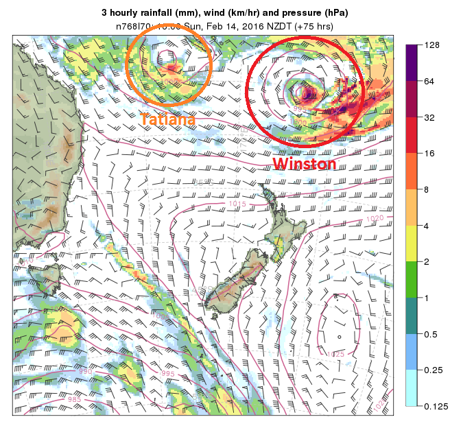 3 hourly rainfall, wind and pressure prediction for 14 February 2016. Expected cyclones circled in red (Winston) and orange (Tatiana).
