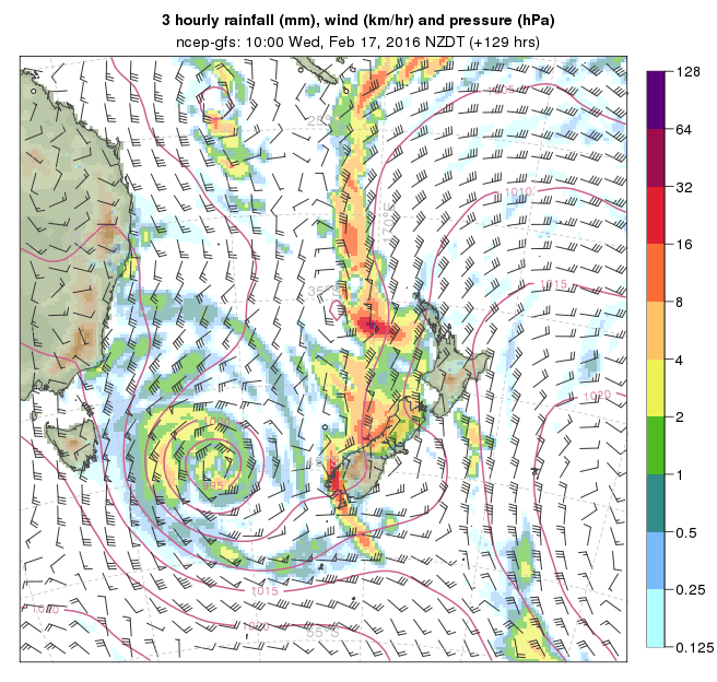 3 hourly rainfall, wind and pressure prediction for 17 February 2016. Expected cyclones circled in red (Winston) and orange (Tatiana).