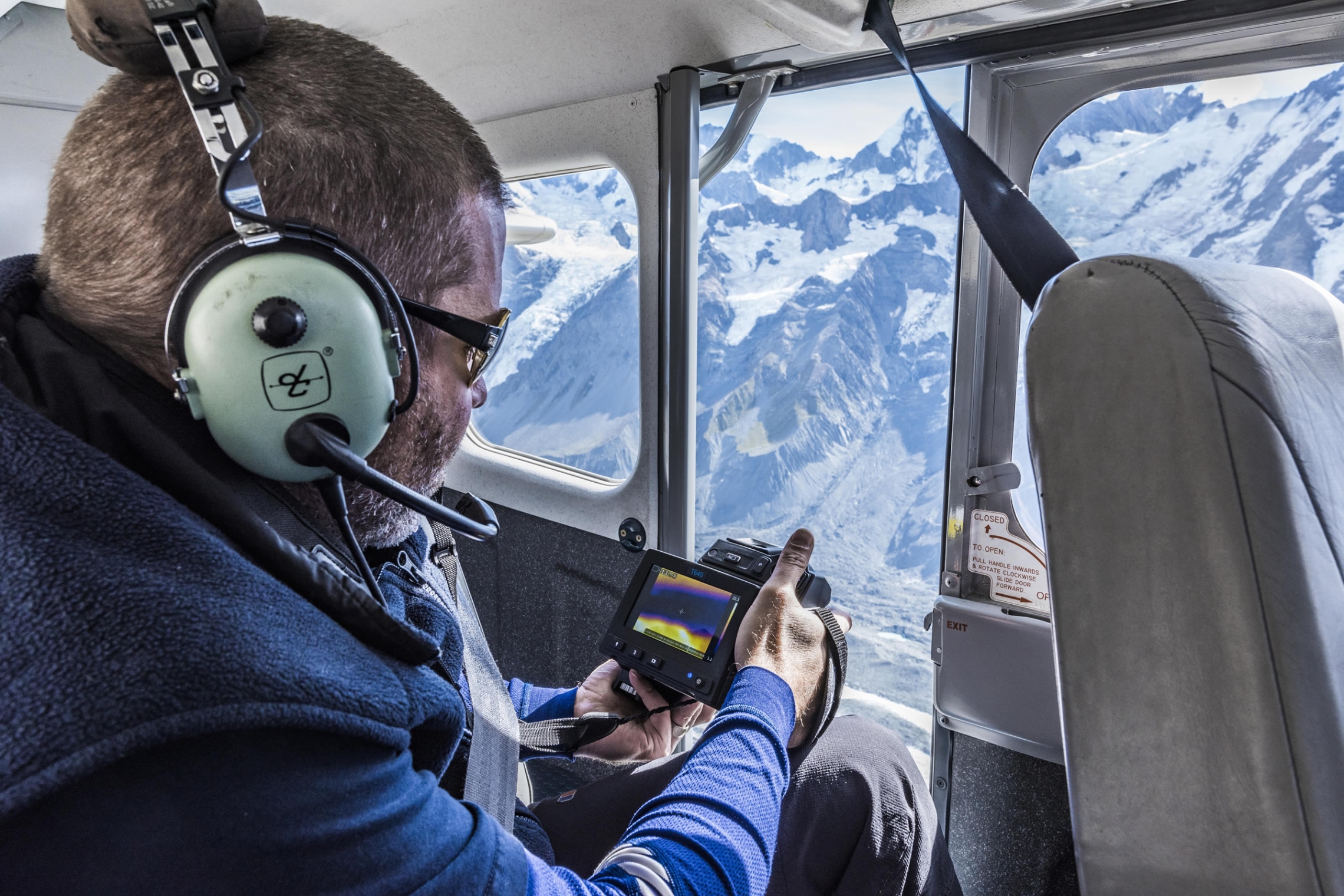 Safely harnessed into position, NIWA's Dr Andrew Lorrey points an FLIR T640 infrared camera out of the open cabin door towards the Tasman Glacier to gather thermal data for the glacier ice, meltwater and the debris cover.