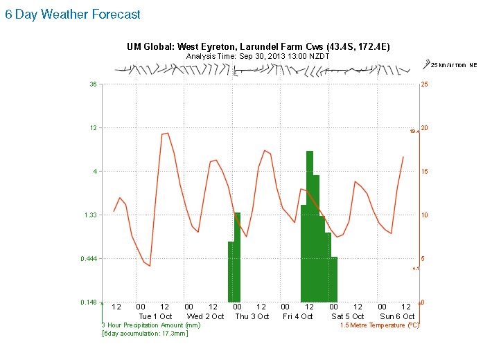 An example of a 6-day weather forecast for rainfall (green) and soil temperature (red).