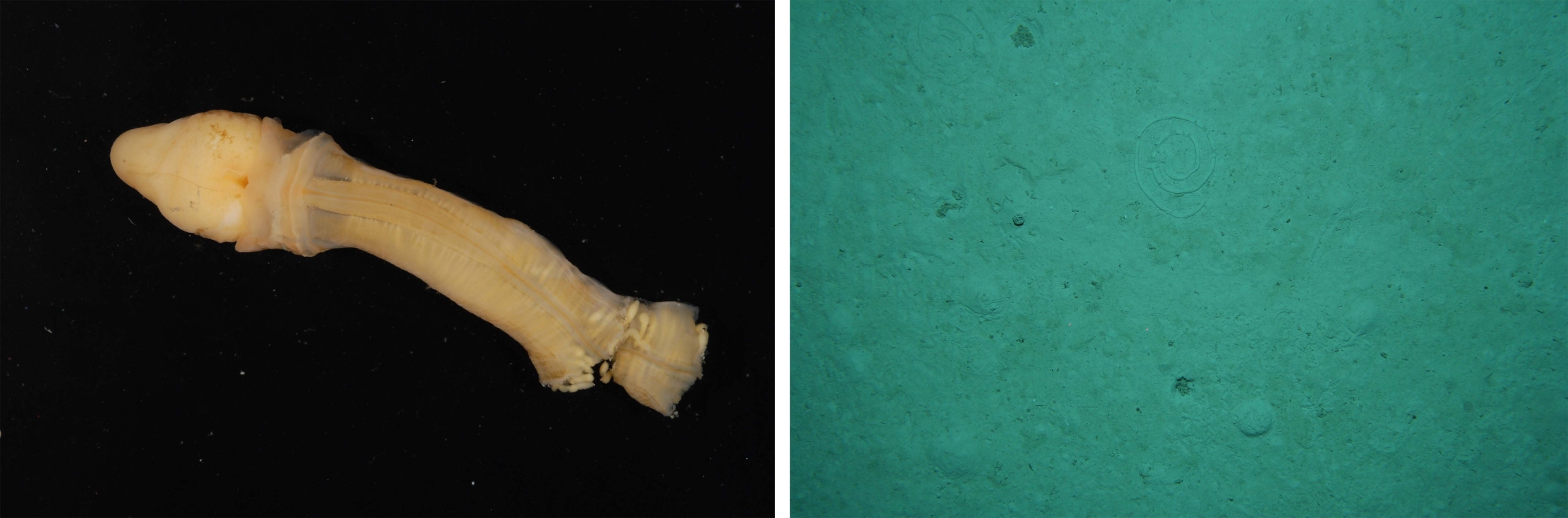 This is just a couple of centimetres fragment (the head end) of an acorn worm from the family Ptychoderidae (left image). It was collected from 644 m deep in the Tauranga Canyon, Bay of Plenty, and is a member of the phylum Hemichordata. These animals make characteristic spiral tracks in the mud on the seafloor as can be seen on this seafloor image from the Challenger Plateau (right image).